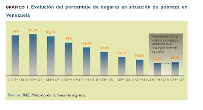 The government measures poverty by counting the number of households whose income is less than twice the cost of the “typical food basket,” and dividing it by the number of households. The ratio you get is your poverty rate. Figured this way, it’s true that by the end of 2007 the percentage of households below the poverty line was 28.5%. The same data indicate poverty was 43.9% in 1998, (curiously, still lower than the eye-popping 80% often quoted by Chávez way back when he was thin, and lower than the 55.1% we had after four years of Chávez)