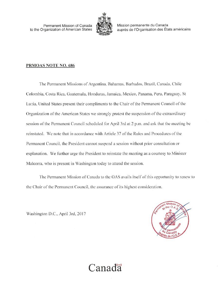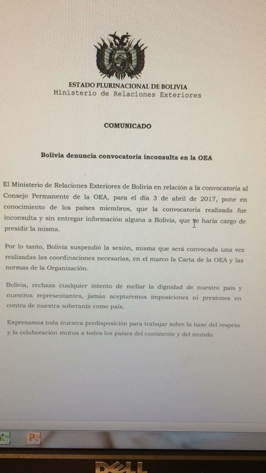 On Friday, after #Autogolpe happened, 20 countries petitioned to hold an emergency session of the Permanent Council on Venezuela this afternoon. This morning, Bolivia, acting as newly appointed president of the CP, decided to suspend the meeting.