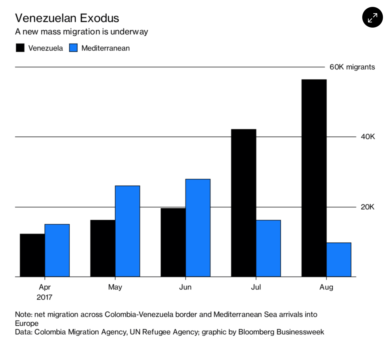 The information void results in different numbers of migrating Venezuelans, with sources wildly varying among themselves. According to BloombergBusinessweek, “The flood of people fleeing Venezuela’s crisis has become one of the world’s great mass migrations, surpassing the flow of refugees and migrants crossing the Mediterranean from North Africa to Europe.”