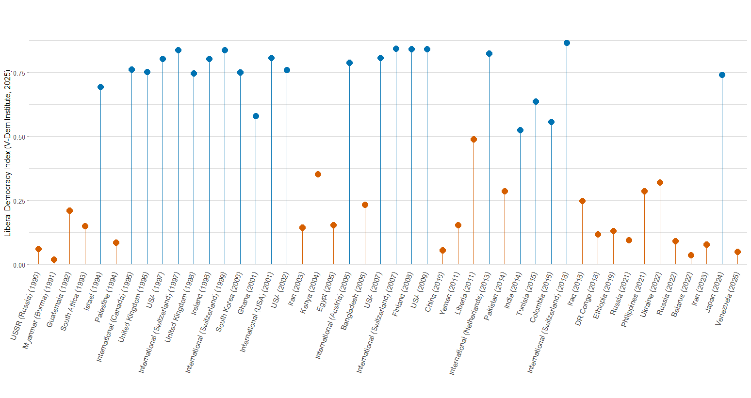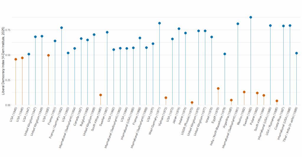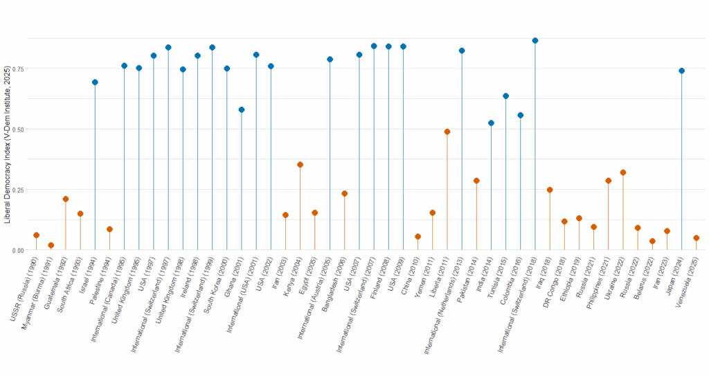 In Venezuela, liberal democracy is at its lowest, as shown in the second figure. The Nobel Prize Committee awarded the prize because of Machado’s activism in nonviolent resistance, electoral organization, and keeping the flame of democracy alive in an authoritarian regime. The Nobel here amplifies the cause of Venezuelan democracy amongst international elites, but does not resolve the long-standing power imbalance.